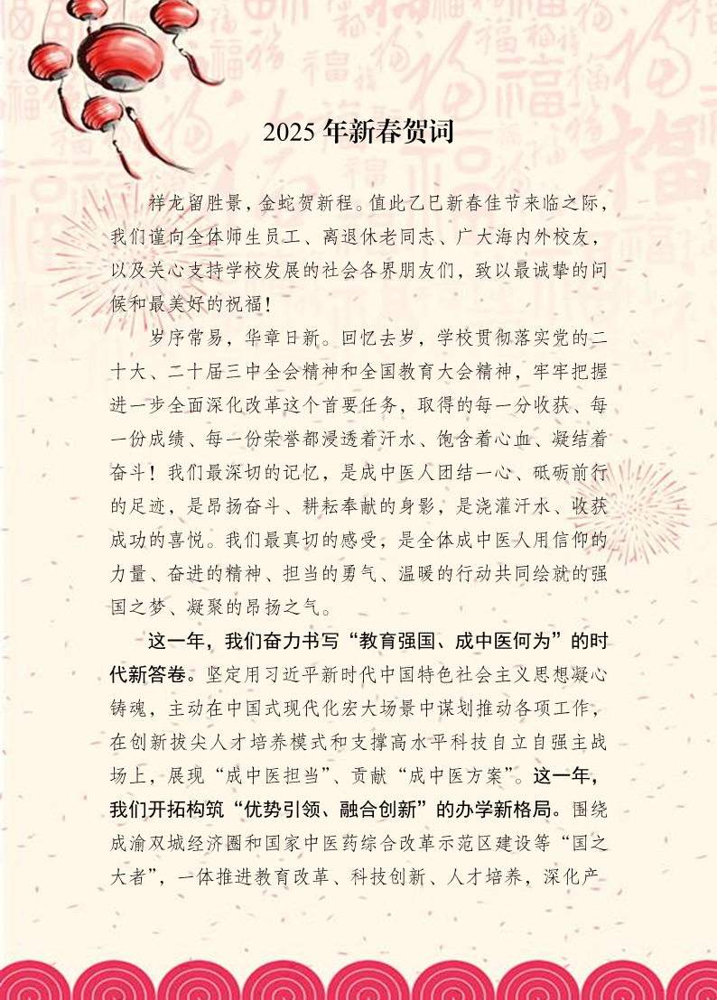 2025年新春贺词 发布时间:2025-01-28 07:00:11 浏览次数: 次 【字体:小 大】 【打印正文】 上一条:新起点、再出发,走出一流中医药大学特色发展之路 下一条:@海内外成中医人,收祝福啦!