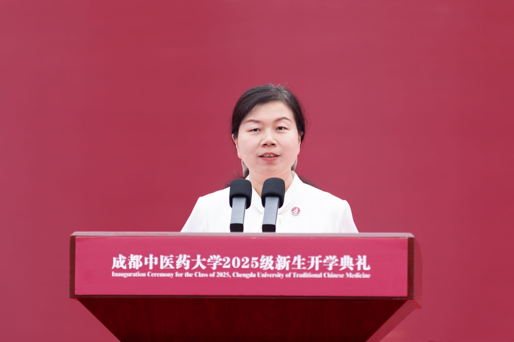 2025级九年制中医学(李斯炽班)新生苏展悦代表新生发言,立志做经典的传承者、创新的开拓者、文化的传播者。号召全体新同学以敬畏之心、勤勉之志、仁爱之心开启在成中医的学习与实践,仰望星空、脚踏实地,积极投身于国家中医药事业的未来中。