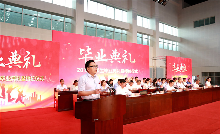 在全场奏唱国歌之后,学校党委书记刘毅以“做‘厚德·博学·精思·笃行’之人”为题发表致辞,祝贺同学们顺利毕业,也对同学们未来的工作和人生进行最后一次深情教诲。
