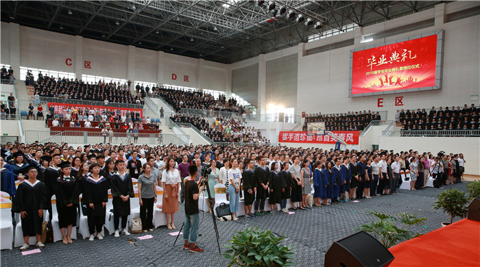 此次毕业典礼首次将会场移到体育馆举行,以容纳更多毕业生到现场感受学校对他们的祝福和期盼。整场典礼庄重大气、情感热烈、感人至深,其间穿插播放了《优秀毕业生感言》《教师祝福》《辅导员祝福》《后勤保安员工祝福》和《校友代表祝福》等视频短片,温馨感人;设置了微信留言墙,通过现场大屏幕将同学们的心声与祝福进行即时展示。体育馆外也设置了留言展板供大家签名纪念。