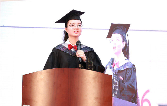 药学院中药资源与开发专业杨寓寒同学作为毕业生代表发言。她代表2018届毕业生感谢学校领导、老师的教诲与栽培,感谢父母的支持与鼓励,感谢同学朋友的信任与扶持,祝愿母校未来更加美好。她表示,作为母校的一分子,不论是继续深造读研还是踏入社会工作,都应当志存高远、潜心修身、继承传统、创新实践、大医精诚,努力成为有信念、有梦想、有奋斗、有奉献的人,成为对中医药事业充满自信、自尊、自觉、自强的人,为振兴中医药,为服务人民群众健康贡献智慧和力量。