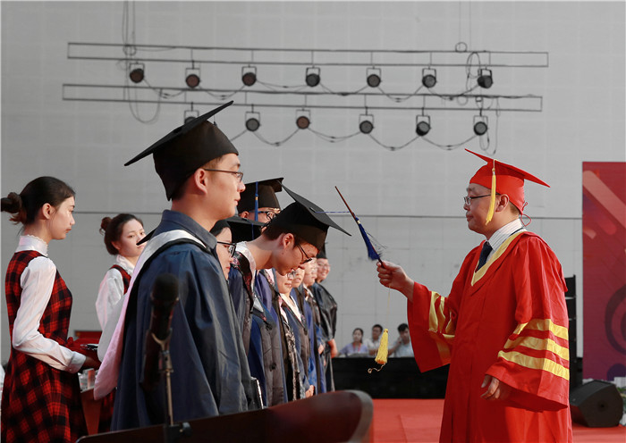 学位评定委员会主席、校长余曙光分别为博士生、硕士生、本科生和境外学生代表颁发毕业证、学位证并拨流苏。
