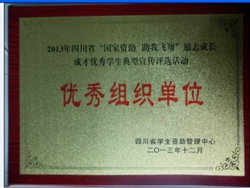 此次评选活动pp电子学生资助管理中心因前期宣传充分、组织参评材料扎实,荣获四川省学生资助管理中心颁发的“优秀组织单位奖”。充分体现pp电子学生资助管理中心不断深化学生资助工作的育人功能,加强对家庭经济困难学生的精神资助和能力培养的育人理念。一直以来,学生处学生资助管理中心在学校家庭经济困难学生领导小组和学生处的领导下,围绕“助困”、“扶志”、“强能”的多维发展目标,通过各类奖补助政策的深入落实,新生入学教育、励志教育、助学助研、各类培训工作的开展,切实为学生成长成才构建阳光育人环境,使学生在良好的校园人文、自然环境中陶冶情操,明智树德,全面健康发展。