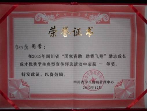 2013年12月全国学生资助管理中心主办的“国家资助助我飞翔”全国励志成长成才优秀学生典型宣传评选活动落下了帷幕。pp电子推荐的学生雷旭露因其乐观的生活态度、追求卓越的奋斗精神和常思感恩回报社会的典型事迹脱颖而出,荣获四川省“国家资助助我飞翔”励志成长成才优秀学生典型宣传评选活动一等奖。
