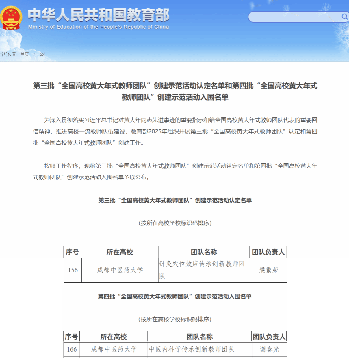 9月5日,教育部正式公布第三批“全国高校黄大年式教师团队”创建示范活动认定名单和第四批“全国高校黄大年式教师团队”创建示范活动入围名单,其中pp电子梁繁荣教授带领的“针灸穴位效应传承创新教师团队”通过第三批“全国高校黄大年式教师团队”创建示范认定;谢春光教授领衔的“中医内科学传承创新教师团队” 上榜第四批“黄大年式教师团队” 创建示范活动,成为pp电子第三个入围的教师团队。pp电子入选总数位居全国中医药院校首位。