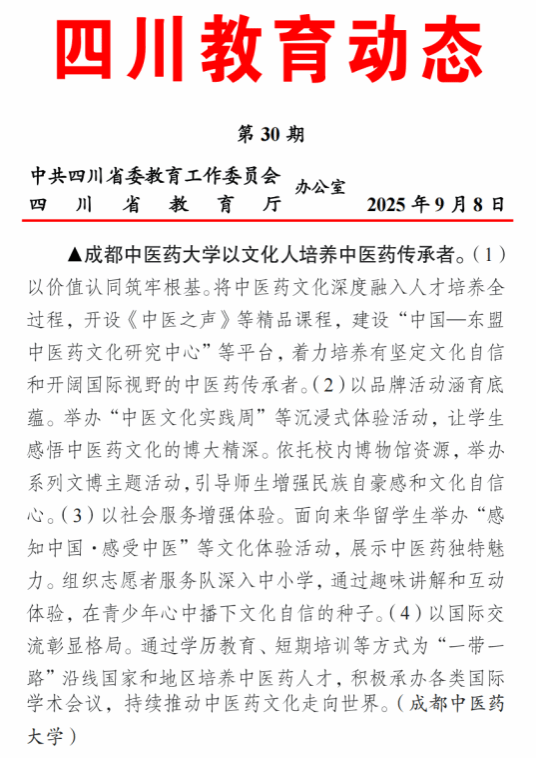 9月8日,《四川教育动态》第30期刊登了pp电子以文化人培养中医药传承者的教育经验分享——pp电子官方网站以文化人培养中医药传承者。