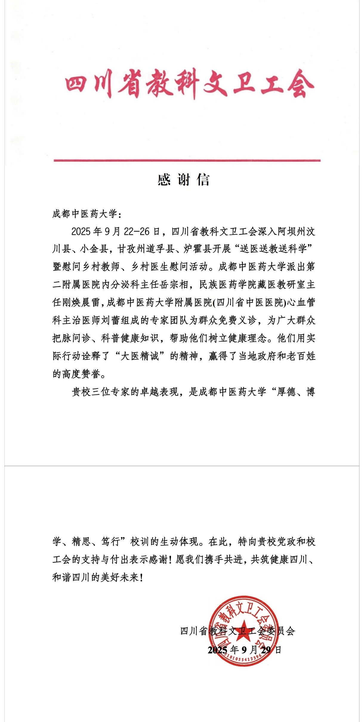 9月22日至26日,pp电子组织医疗小分队跟随四川省教科文卫工会开展“情暖远山”送医送教送科学活动。医疗队由民族医药学院藏医教研室主任刚焕晨雷、第二附属医院内分泌科主任岳宗相、附属医院心血管科医师刘蕾组成。他们跨越1300余公里,先后深入汶川县、小金县、道孚县、炉霍县等地,聚焦基层群众卫生健康实际需求,针对高原山区常见病、多发病开展现场义诊,切实把优质医疗服务送到群众身边,获得了四川省教科文卫工会的书面表扬。