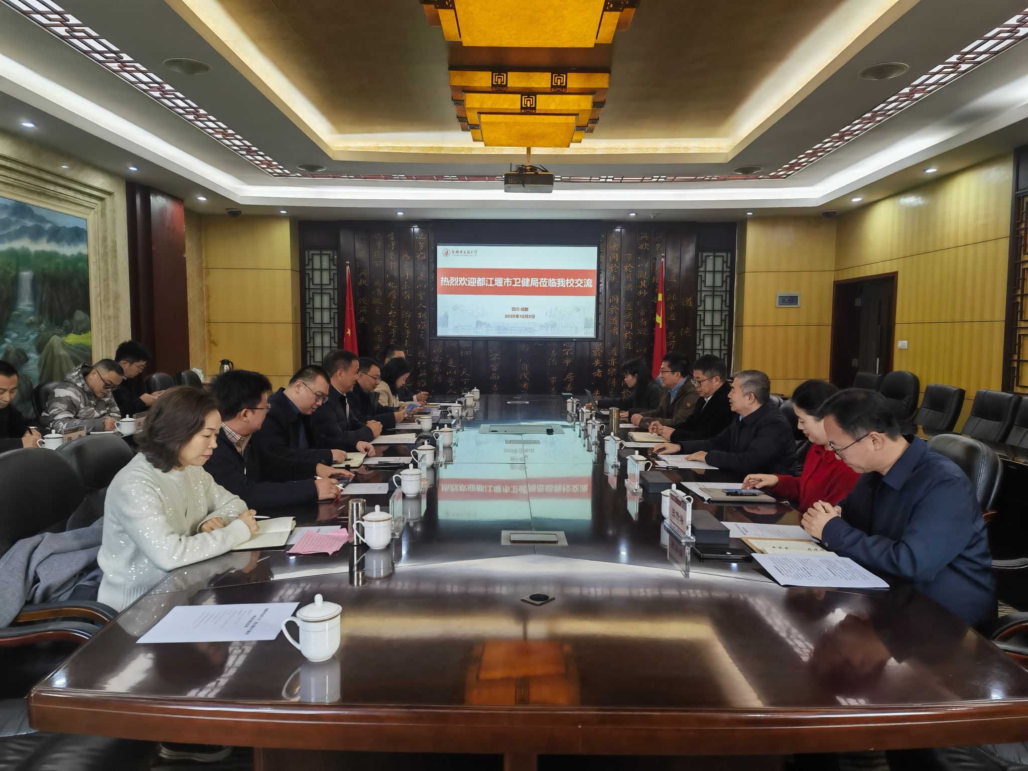 12月2日上午,都江堰市卫生健康局党组书记、局长罗斌一行来校交流座谈。学校党委书记张泽钧,党委常委、副校长冯全生出席座谈会。会议由对外合作处处长佟枫主持。