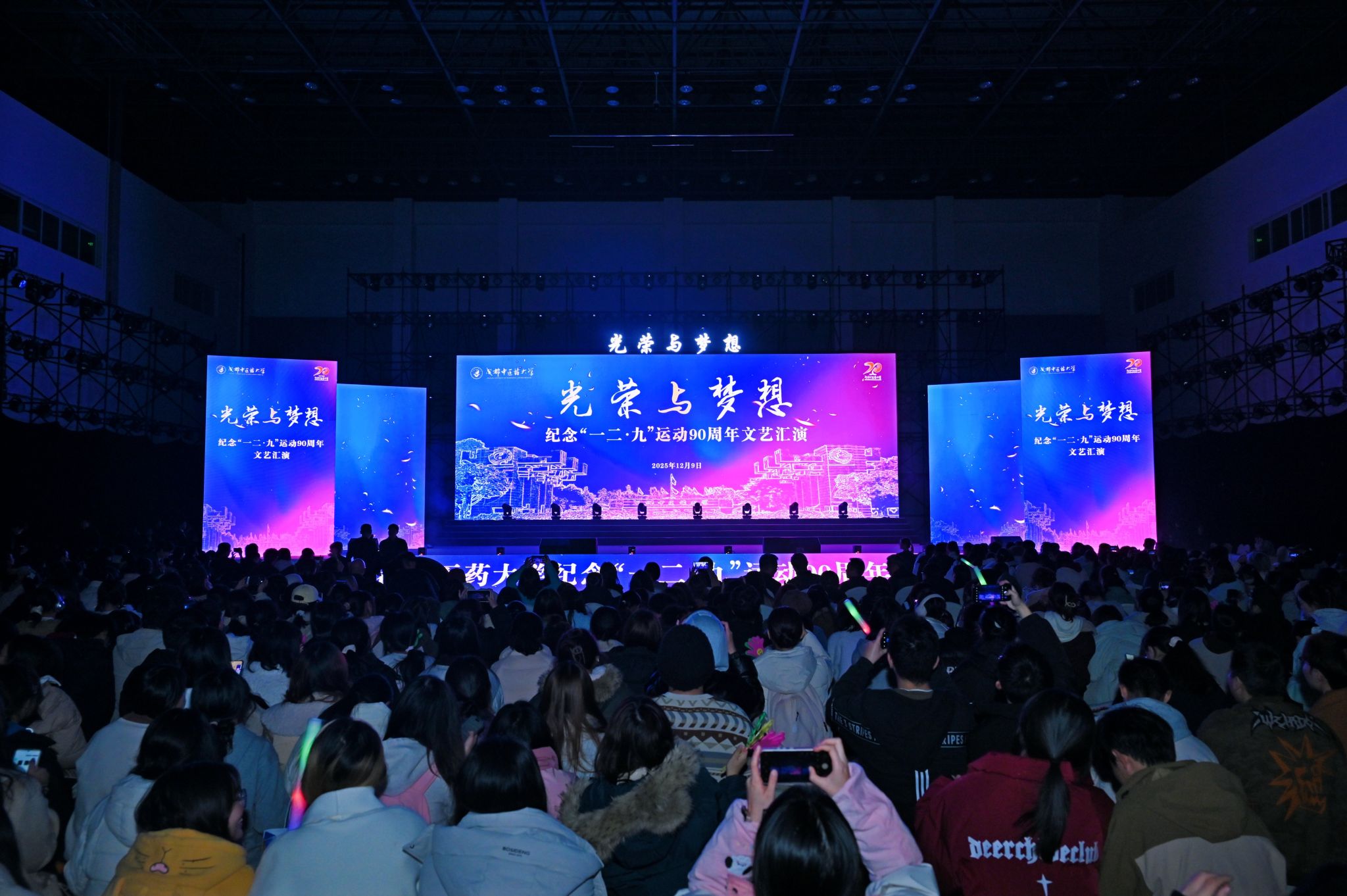12月9日晚,学校在温江校区体育馆隆重举行“光荣与梦想”——纪念“一二·九”运动90周年文艺汇演。共青团四川省委副书记张志君,蜀道集团成渝高速副总经理黑比拉彝,校领导张泽钧、曾芳、杨静、郑学斌、国锦琳,学校各职能部门负责人、各学院领导、师生代表共计2000余人齐聚现场,共同回望革命先辈救亡图存的峥嵘岁月,传承爱国主义精神,凝聚新时代青年奋进力量。