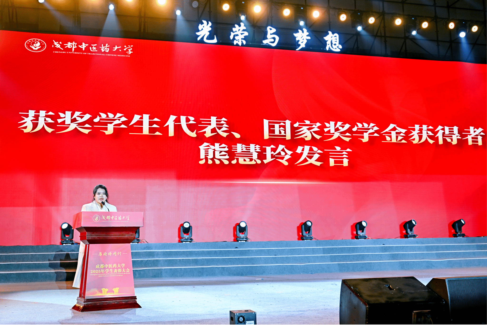 会上,国家奖学金获得者、针灸推拿学院熊慧玲作为受表彰学生代表发言。
