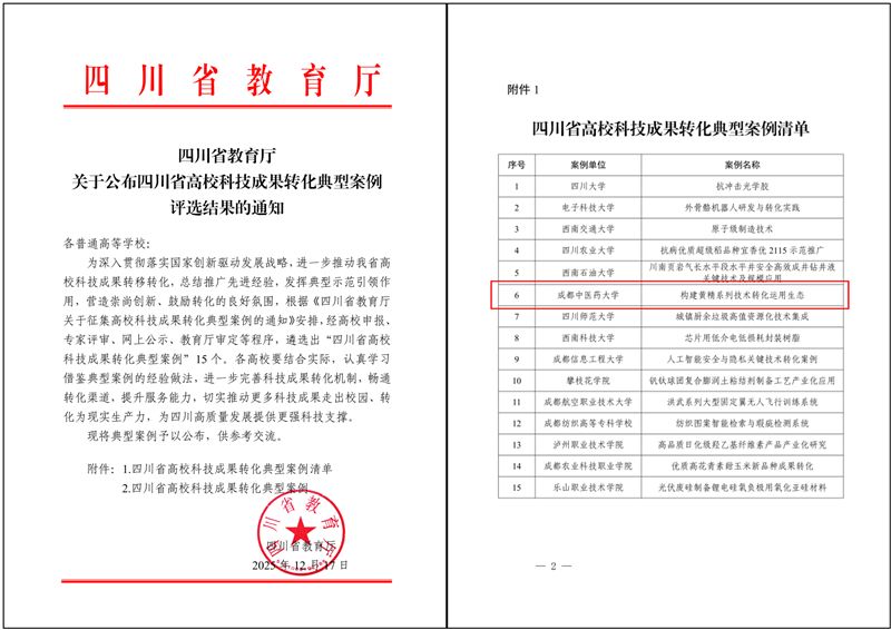 12月17日,四川省教育厅发布《关于公布四川省高校科技成果转化典型案例评选结果的通知》,全省共遴选15项具有示范效应的科技成果转移转化案例,pp电子“黄精系列技术成果转化”项目成功入选。
