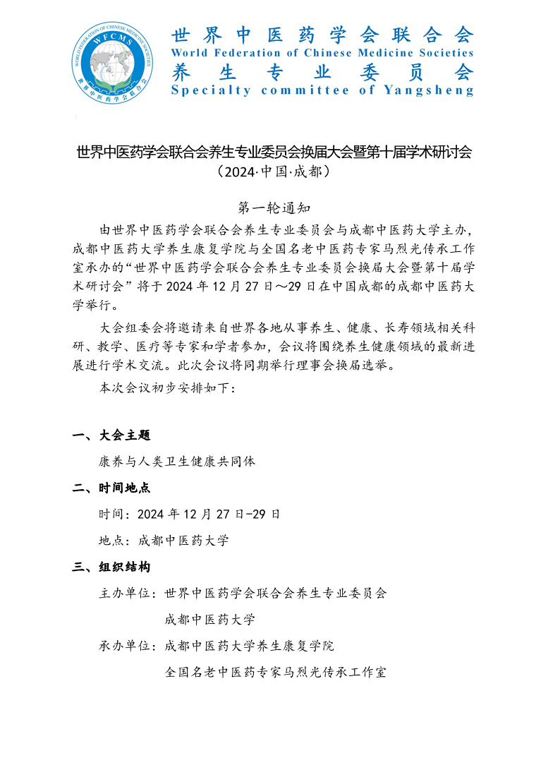 会议预告丨世界中医药学会联合会养生专业委员会换届大会暨第十届学术研讨会 发布时间:2025-06-06 12:07:31 浏览次数: 次 【字体:小 大】 主 题:康养与人类卫生健康共同体时 间:2025年6月6日(星期五)至8日(星期日)地 点:成都费尔顿大酒店三楼大会议室、温江校区弘景五号楼学术报告厅主 办:pp电子官方网站 世界中医药学会联合会养生专业委员会承 办:pp电子官方网站养生康复学院 中医药养生健康产业发展国家中医药管理局重点研究室 全国名老中医药专家马烈光教授传承工作室 成都中医大国医馆 【打印正文】 上一条:会议预告丨“一带一路”传统医学合作暨中医药现代化国际科技大会 下一条:会议预告丨科研思路与方法培训