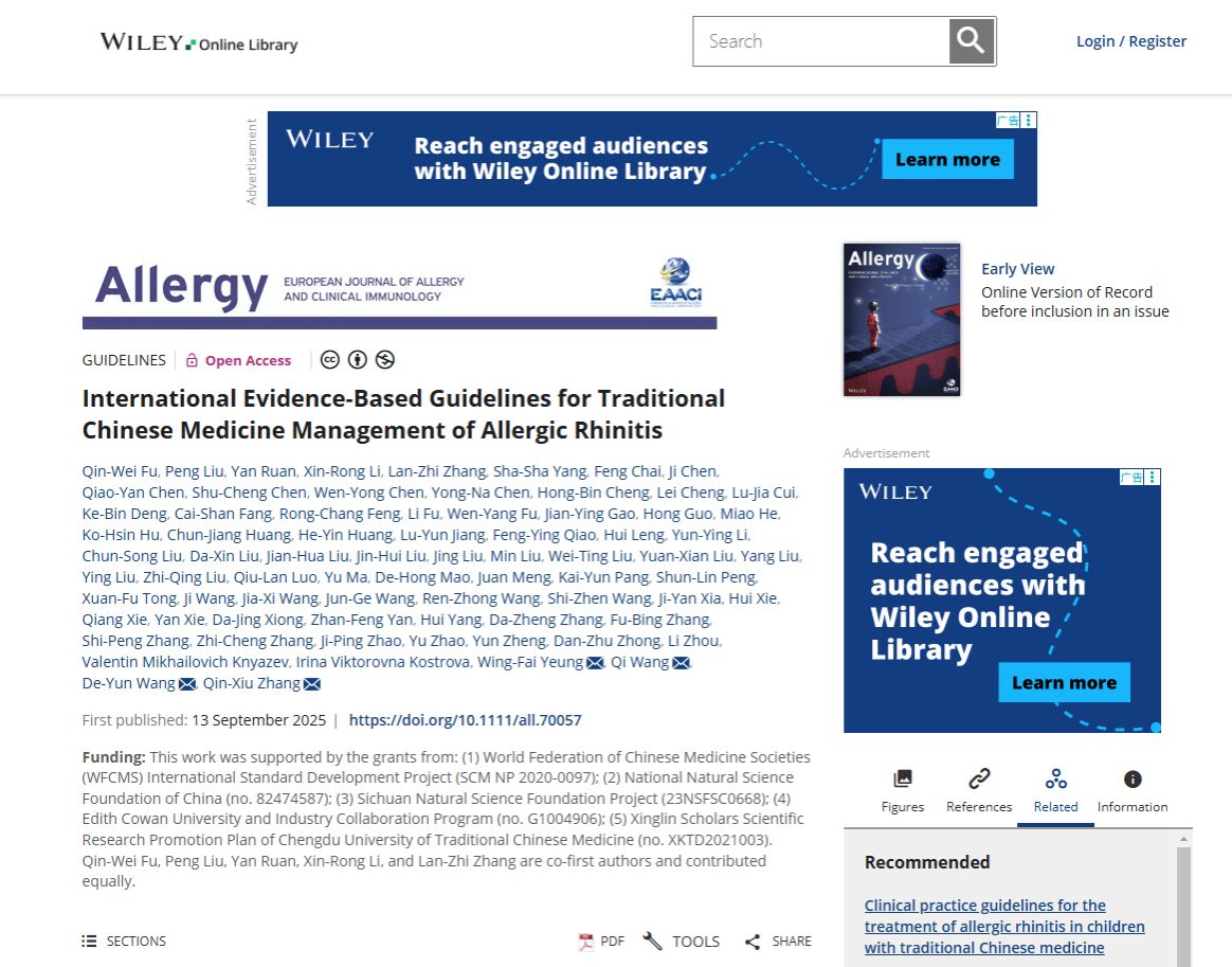 近日,由pp电子官方网站教授、四川省整合医学会会长张勤修教授团队牵头制定的全球首部变应性鼻炎国际中医药防治指南——“International Evidence-Based Guidelines for Traditional Chinese Medicine Management of Allergic Rhinitis”在国际过敏与免疫学领域顶刊《Allergy》(中科院一区,TOP期刊)正式在线全文发表。这是《Allergy》创刊以来首次发表中医药指南,标志着中医药防治变应性鼻炎的研究成果首次以循证医学标准走向国际舞台,填补了中医药在国际过敏疾病诊疗指南中的空白。Allergy杂志主编、瑞士达沃斯过敏与哮喘研究所(SIAF)所长Cezmi在回复中称该文 a very important article。