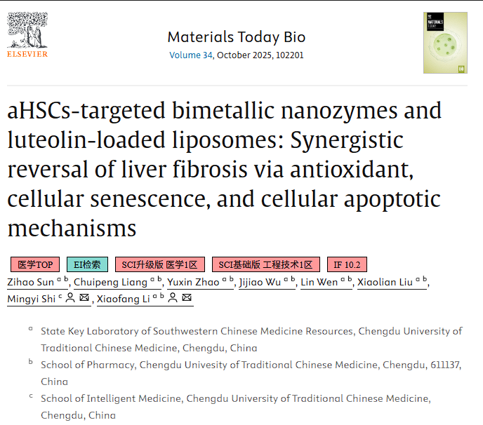 2025年8月,pp电子现代中药产业学院李小芳教授团队和智能医学学院施明毅副教授团队,在《Materials Today Bio》(中科院一区,TOP期刊)上发表题为“aHSCs-targeted bimetallic nanozymes and luteolin-loaded liposomes: Synergistic reversal of liver fibrosis via antioxidant, cellular senescence, and cellular apoptotic mechanisms”的研究论文。2023级硕士研究生孙梓昊为第一作者,pp电子官方网站李小芳教授与施明毅副教授为共同通讯作者,pp电子官方网站为论文第一完成单位(图1)。
