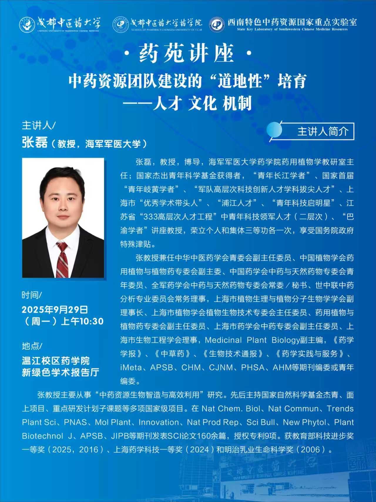 会议预告丨药苑讲座 发布时间:2025-09-28 15:49:17 浏览次数: 次 【字体:小 大】 题 目:中药资源团队建设的“道地性”培育——人才 文化 机制时 间:2025年9月29日(星期一) 上午10:30地 点:温江校区药学院新绿色学术报告厅主讲人:张 磊 海军军医大学主 办:pp电子官方网站 pp电子官方网站药学院 西南特色中药资源国家重点实验室 【打印正文】 上一条:会议预告丨2025年中药制剂大会 暨世界中医药学会联合会中药新型给药系统专业委员会第十五届学术年会、 世界中医药学会联合会中药药剂专业委员会第十九届学术年会、 中华中医药学会中药制剂分会第二十五届学术年会 会议通知(第三轮) 下一条: 学术成果丨pp电子学者构建基于AI与知识图谱的中医药多维数据挖掘与机制解析平台