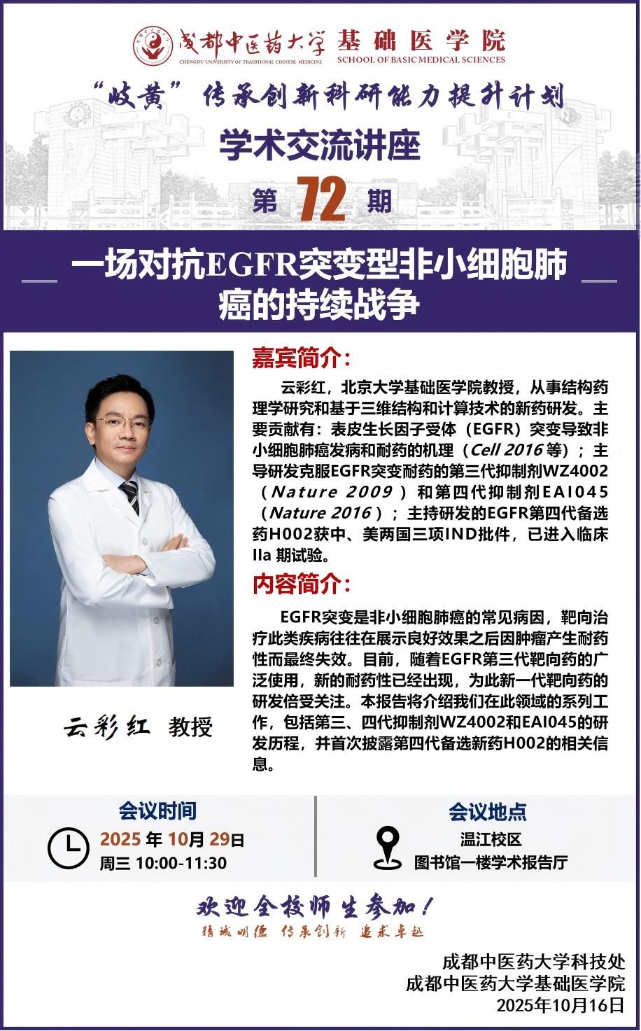会议预告丨“岐黄”传承创新科研能力提升计划学术交流讲座第72期 发布时间:2025-10-16 17:34:59 浏览次数: 次 【字体:小 大】 题 目:一场对抗EGFR突变型非小细胞肺癌的持续战争时 间:2025年10月29日 (星期三) 上午10:00地 点:温江校区图书馆一楼学术报告厅主讲人:云彩红 北京大学主 办:科技处 基础医学院 【打印正文】 上一条:学术成果丨pp电子学者在《Carbohydrate Polymers》发表基于百香果籽仿生结构设计的苦味淬灭速凝微囊构建研究成果 下一条:学术成果丨pp电子学者在《Computers and Electronics in Agriculture》发表无人机遥感调查高原药用植物资源研究成果
