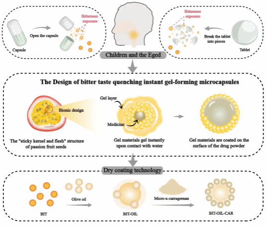 为满足儿童等特殊人群的服药需求,改善苦味中药的适口性,该研究首次提出苦味淬灭“速凝微囊”新概念。速凝微囊(Instant Gel-Forming Microcapsules)是指凝胶干粉材料包覆于药物粉末表面,遇水后凝胶干粉瞬间凝胶化,快速相变为凝胶屏障层将药物粉末包裹在内,最终形成形似于百香果籽的凝胶状微囊(图2)。