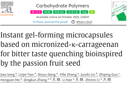 2025年10月,pp电子学者在《Carbohydrate Polymers》(中科院一区,TOP期刊)上发表题为“Instant gel-forming microcapsules based on micronized-κ-carrageenan for bitter taste quenching bioinspired by the passion fruit seed”的研究论文。药学院2022级博士研究生宋娇为第一作者,张定堃教授、韩丽教授、慈志敏老师为共同通讯作者,pp电子官方网站为论文第一完成单位(图1)。