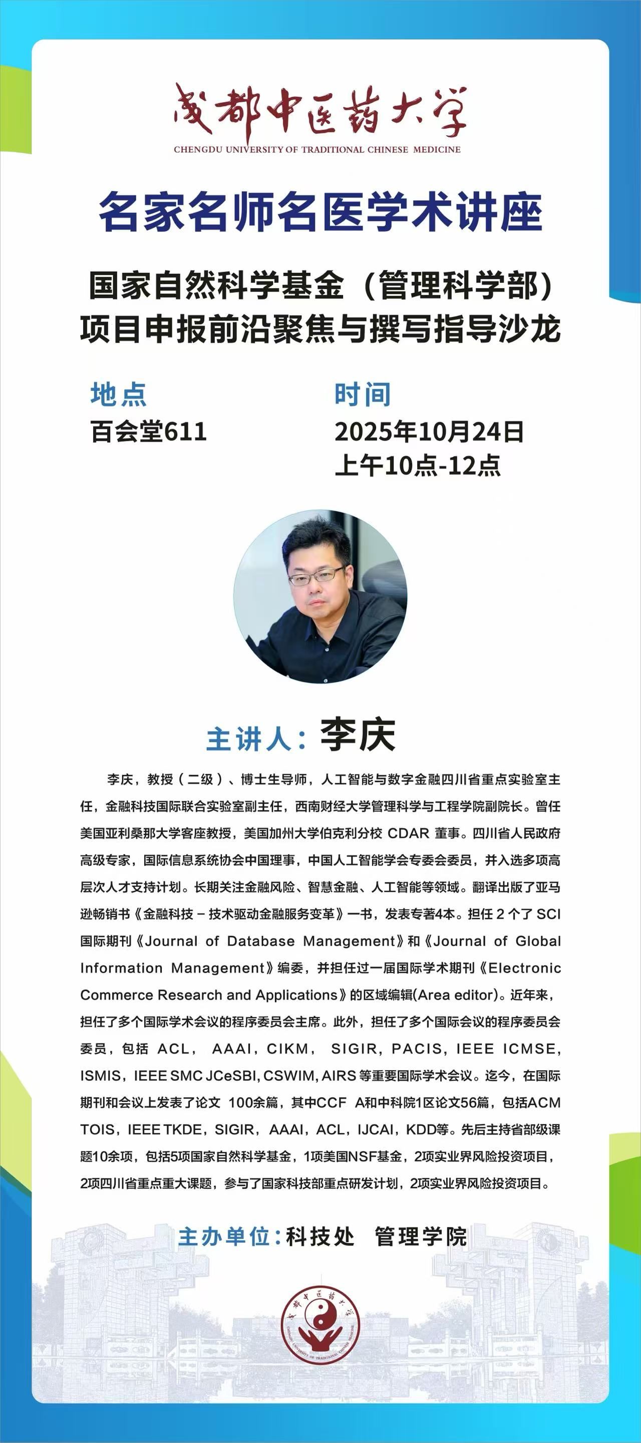 会议预告丨名家名师名医学术讲座 发布时间:2025-10-20 10:21:26 浏览次数: 次 【字体:小 大】 题 目:国家自然科学基金(管理科学部)项目申报前沿聚焦与撰写指导沙龙时 间:2025年10月24日(星期五) 上午10:00地 点:温江校区百会堂611主讲人:李 庆 西南财经大学主 办:科技处 管理学院 【打印正文】 上一条:学术成果丨pp电子学者在青蒿琥酯抗肿瘤免疫调控机制研究方面取得新进展 下一条:学术成果丨pp电子学者在《Carbohydrate Polymers》发表基于百香果籽仿生结构设计的苦味淬灭速凝微囊构建研究成果