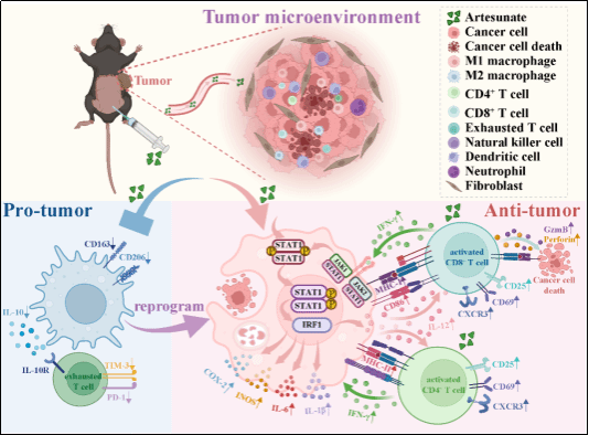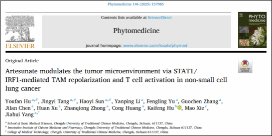 近日,pp电子基础医学院中医药与肿瘤团队杨佳荟教授课题组在青蒿琥酯(Artesunate,AS)调控肿瘤免疫微环境及增强免疫治疗效果的机制研究方面取得新进展。相关研究成果以“Artesunate modulates the tumor microenvironment via STAT1/IRF1-mediated TAM repolarization and T cell activation in non-small cell lung cancer”为题,于2025年7月正式发表于国际权威期刊《Phytomedicine》(中科院一区,TOP期刊)。基础医学院硕士研究生胡又凡、唐静宜与孙皓怡为论文共同第一作者,杨佳荟教授为通讯作者,pp电子官方网站为论文完成单位。