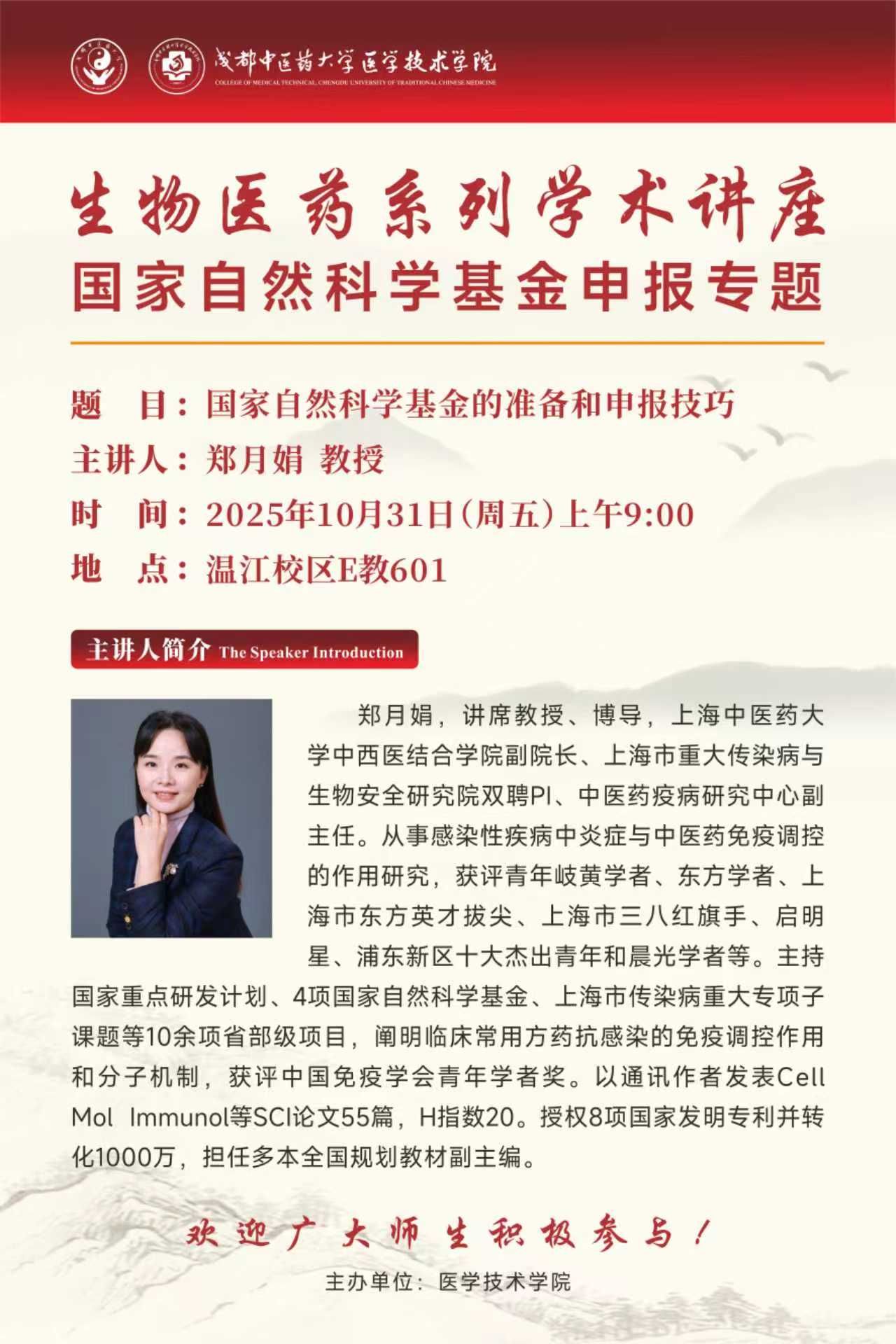 会议预告丨生物医药系列学术讲座 国家自然科学基金申报专题 发布时间:2025-10-31 08:37:44 浏览次数: 次 【字体:小 大】 题 目:国家自然科学基金的准备和申报技巧时 间:2025年10月31日(星期五) 上午09:00地 点:温江校区E教601主讲人:郑月娟 上海中医药大学主 办:医学技术学院 【打印正文】 上一条:会议预告丨名家名师名医学术讲座 pp电子官方网站2026年度国家自然科学基金申报科研思路与方法培训 下一条:会议预告丨名家名师名医学术讲座:器官芯片与药物研发