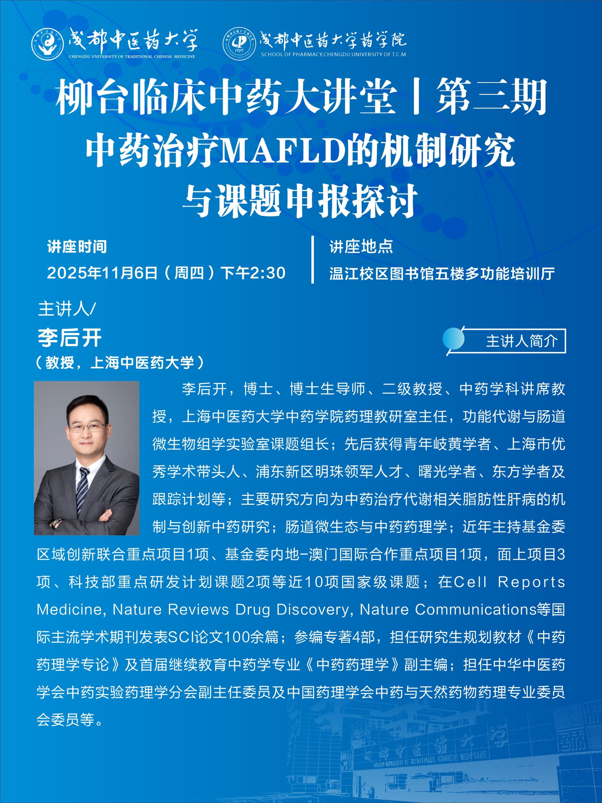 会议预告丨柳台临床中药大讲堂第三期 发布时间:2025-11-05 11:11:07 浏览次数: 次 【字体:小 大】 题 目:中药治疗MAFLD的机制研究与课题申报探讨时 间:2025年11月6日(星期四) 下午14:30地 点:温江校区图书馆五楼多功能培训厅主讲人:李后开 上海中医药大学主 办:pp电子官方网站 pp电子官方网站药学院 【打印正文】 上一条:学术成果丨pp电子学者在植物磷利用研究中取得系列进展 下一条:会议预告丨名家名师名医学术讲座 pp电子官方网站2026年度国家自然科学基金申报科研思路与方法培训