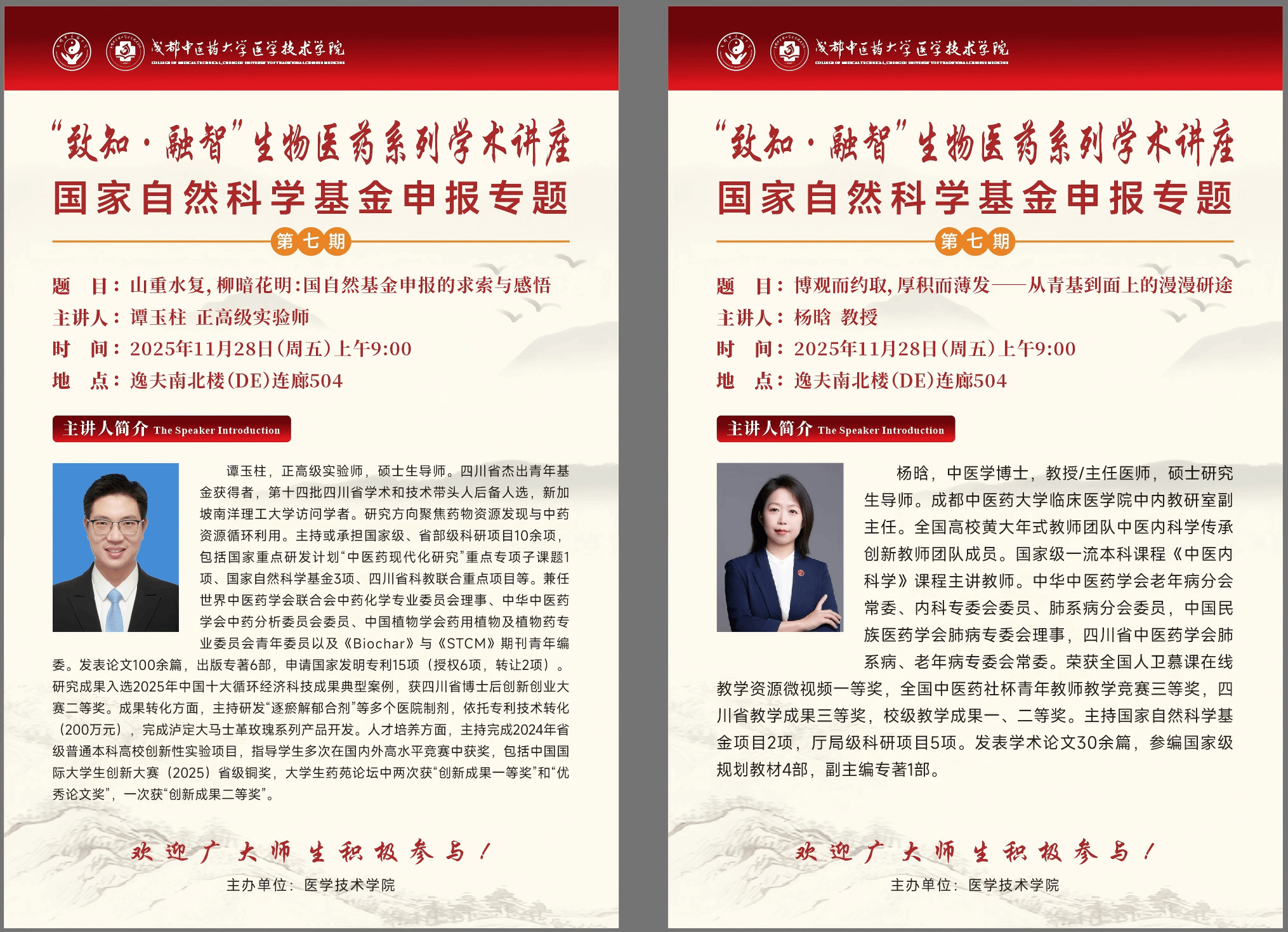 会议预告丨“致知·融智”生物医药系列学术讲座 国家自然科学基金申报专题第七期 发布时间:2025-11-26 17:02:34 浏览次数: 次 【字体:小 大】 时 间:2025年11月28日 (星期五) 上午9:00地 点:温江校区逸夫南北楼(DE)连廊504主 办:医学技术学院题 目1:山重水复,柳暗花明:国自然基金申报的求索与感悟主讲人:谭玉柱 pp电子官方网站题 目2:博观而约取,厚积而薄发——从青基到面上的漫漫研途主讲人:杨 晗 pp电子官方网站 【打印正文】 上一条:学术成果丨pp电子学者在针刺治疗功能性消化不良中枢机制研究中取得新进展 下一条:会议预告丨柳台临床中药大讲堂第五期