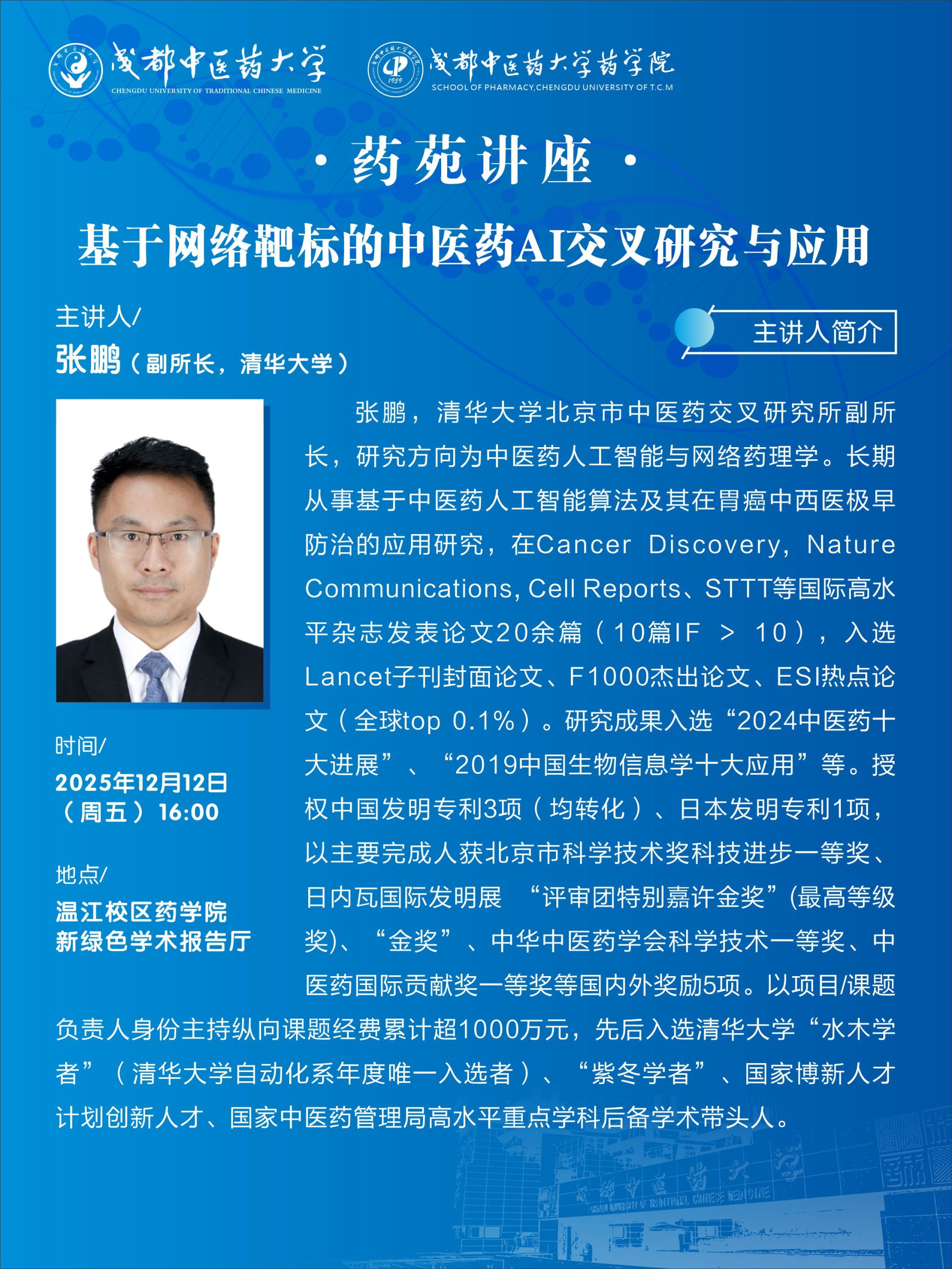 会议预告丨药苑讲座 发布时间:2025-12-12 10:17:21 浏览次数: 次 【字体:小 大】 题 目:基于网络靶标的中医药AI交叉研究与应用时 间:2025年12月12日(星期五) 下午16:00地 点:温江校区药学院新绿色学术报告厅主讲人:张 鹏 清华大学主 办:pp电子官方网站 pp电子官方网站药学院 【打印正文】 上一条:会议预告丨柳台临床中药大讲堂第六期 下一条:会议预告丨药苑讲座