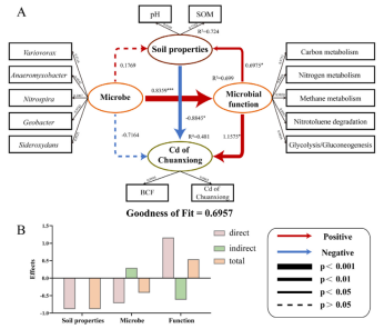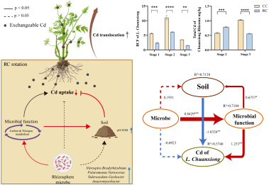 该论文系统地揭示了稻芎轮作(RC轮作)模式在降低川芎镉富集方面的成效与核心机理。此模式不仅能大幅降低川芎的镉含量,还能在保障川芎总产量的同时,显著推动其有效成分的积累,达成“控镉、增产、提质”的三重目标。研究阐明其核心优势机制:稻芎轮作通过重构根际微生物群落,富集碳氮代谢相关的有益功能微生物,进而提升土壤pH值与有机质含量,触发了“根际微生物→微生物功能→土壤性质→植物镉积累”的级联调控效应,从源头阻断了镉元素向川芎植株的迁移与富集。