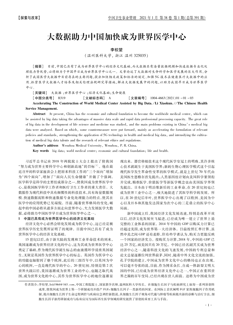 《中国卫生事业管理》于2021年第一期杂志“探索与改革”栏目刊登了2021年首篇院士约稿—《大数据助力中国加快成为世界医学中心》,本文由中国工程院院士、国家教学名师、温州医科大学校长李校堃独撰。文章论述了大数据对生命科学和医学发展的巨大作用,分析了我国医学大数据中目前存在的主要问题,提出加快相关政策和标准的制定、加强5G技术在健康医疗大数据中的应用、抓紧医学大数据人才培养及相关伦理法规研究等措施,解决大数据发展中的问题,以助力我国早日成为世界医学中心。