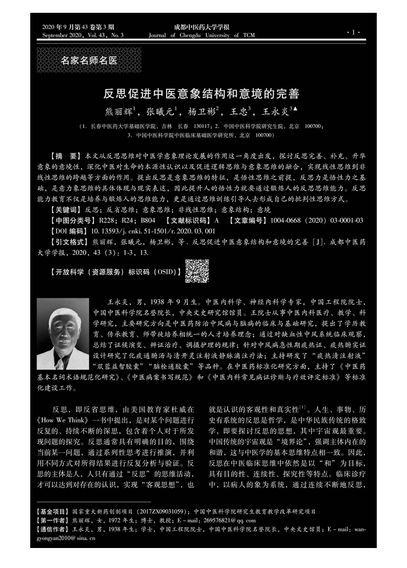 《pp电子官方网站学报》于2020年第三期的“名家名师名医”栏目刊登了 2020年首篇院士约稿——《反思促进中医意象结构和意境的完善》,本文由pp电子省部共建西南特色中药资源国家重点实验室学术委员会主任委员王永炎院士团队发表。本文从反思思维对中医学意象理论发展的作用这一角度出发,从“反思完善动态意象结构的真实合理性”、“反思完善、补充、升华意象的意境性”、“反思思维深化中医对生命本源性的认识”、“反思思维促进实现线性思维到非线性思维的意境跨越”、“反思是意象思维的特征,是悟性思维之前提”、“医案之按语是反思思维的历史痕迹和实践依据”等六个方面围绕“反思思维与中医意象”作出探讨。