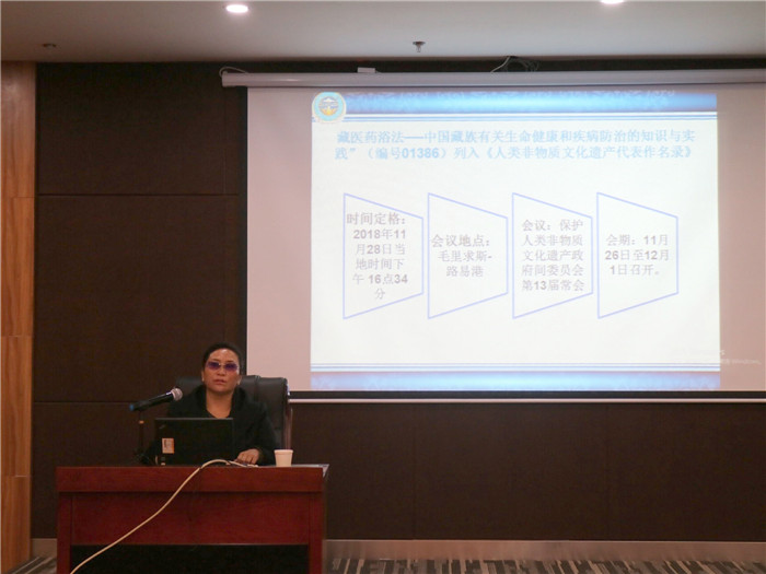 《四部医典》是藏医药的经典著作,为藏医药学中最系统、最完整、最根本的理论体系。“藏医药浴法”是藏医药的特色诊疗技术。 今年5月28日,《四部医典》成功入选《世界记忆亚太地区名录》;11月28日,“藏医药浴法——中国藏族有关生命健康和疾病防治的知识和实践”成功列入联合国教科文组织人类非物质文化遗产代表作名录。白玛央珍院长是这两项申报工作的核心成员,亲身经历了申报、评审的全过程。报告会上,白玛央珍介绍了这两项申报《名录》的规则、名称的使用、文本的要求,针对申报的文本进行了详细解读。她还播放了令人震撼的申遗宣传片。她勉励藏医药专业的学生,要树立民族自尊心和自信心,做好新一代的传承人,充分发掘民族传统医学优势,做好藏医药浴法的传承与实践。