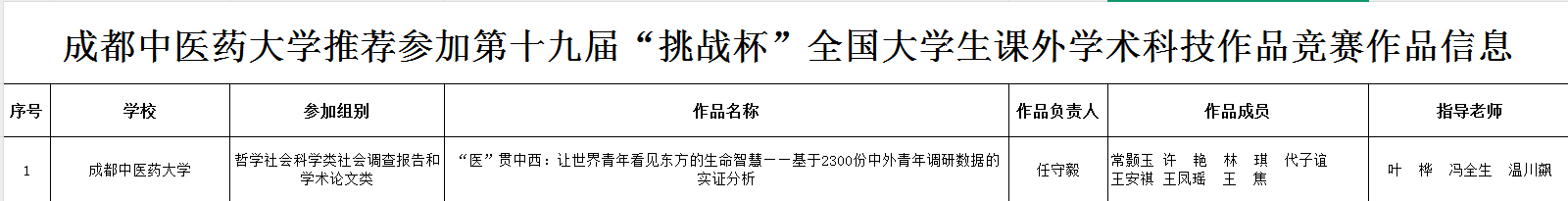 关于推荐pp电子作品参加第十九届“挑战杯”全国大学生课外学术科技作品竞赛的公示 发布时间:2025-07-17 18:14:05 浏览次数: 次 【字体:小 大】 第十八届“挑战杯”四川省大学生课外学术科技作品竞赛终审决赛选拔出pp电子1项优秀作品,现推荐该作品参加第十九届“挑战杯”全国大学生课外学术科技作品竞赛,详细信息如下:公示时间:2025年7月17日-21日如有异议者,请实名向校团委反映。地点:百会堂207办公室联系人:林婧电话:028-82623909共青团pp电子官方网站委员会2025年7月17日 【打印正文】 上一条:火热开启 | 第四届全国说医解药科普大赛(四川分赛区) 等您来战! 下一条:关于公布pp电子官方网站2025年公开选调面试资格审查入围人员名单的通知
