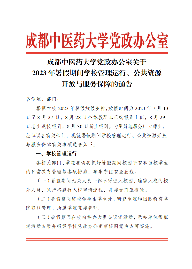 pp电子官方网站党政办公室关于2023年暑假期间学校管理运行、公共资源开放与服务保障的通告 发布时间:2023-07-06 22:41:50 浏览次数: 次 【字体:小 大】 【打印正文】 上一条:pp电子官方网站2023年高等学历继续教育拟招生专业备案结果和校外教学点设置备案结果 下一条:pp电子官方网站党政办公室关于2023年端午节放假的通知