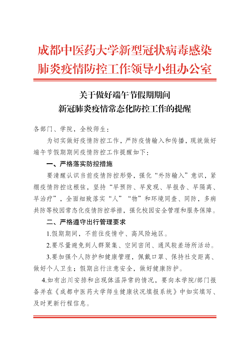 关于做好端午节假期期间疫情防控工作的提醒 发布时间:2021-06-11 14:24:47 浏览次数: 次 【字体:小 大】 【打印正文】 上一条:关于启动《pp电子官方网站章程》修订工作的公告 下一条:关于2021年端午节放假有关事项的通知