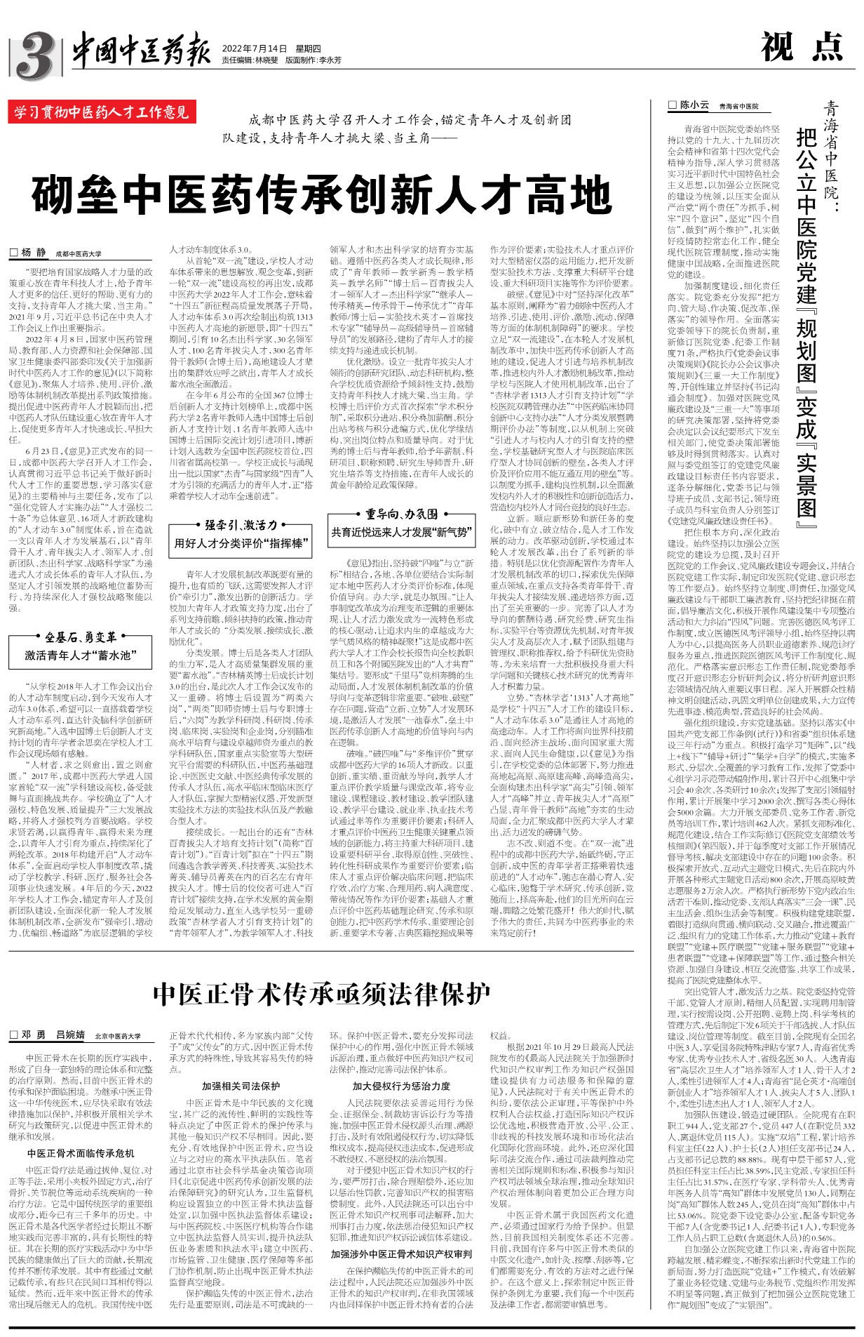 2022年4月8日,国家中医药管理局、教育部、人力资源和社会保障部、国家卫生健康委四部委印发《关于加强新时代中医药人才工作的意见》(以下简称《意见》),聚焦人才培养、使用、评价、激励等体制机制改革提出系列政策措施。提出促进中医药青年人才脱颖而出,把中医药人才队伍建设重心放在青年人才上,促使更多青年人才快速成长、早担大任。