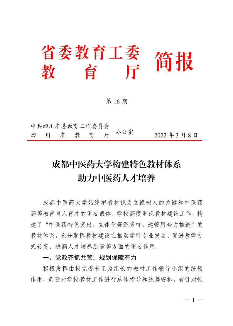 《省委教育工委简报》:pp电子官方网站构建特色教材体系 助力中医药人才培养 发布时间:2022-03-09 00:00:00 浏览次数: 次 【字体:小 大】 时间:2022年3月8日来源:《省委教育工委简报》内容: 【打印正文】 上一条:四川观察 | 代表委员请回答⑮曾芳:中医类新办专业要解决就业瓶 下一条:锦观新闻 | 全国政协委员、pp电子官方网站副校长曾芳:为中医新办专业毕业生就业解决后顾之忧