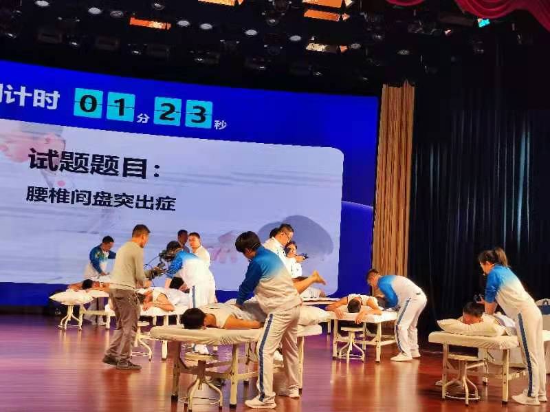 在教师组决赛的推拿环节,9位选手同台操作,限时6分钟。由裁判代表抽签选择出了本轮比赛题目的操作部位——腰椎间盘突出症。选手操作时,裁判上台逐一为选手打分,去除最高分和最低分,取另3位裁判的平均分,乘0.2系数即为该选手的最终得分。相对简短的6分钟操作时间,全方位考验参赛教师的针灸推拿临床技能水平和现场应变能力。