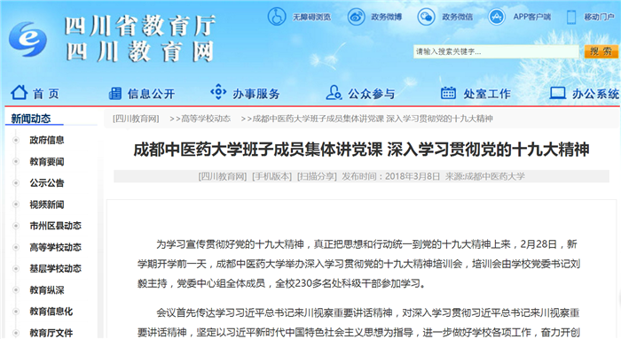 会议首先传达学习习近平总书记来川视察重要讲话精神,对深入学习贯彻习近平总书记来川视察重要讲话精神,坚定以习近平新时代中国特色社会主义思想为指导,进一步做好学校各项工作,奋力开创建设特色鲜明的一流中医药大学新局面,提出明确要求。 会议指出,习近平总书记这次来川视察指导并发表重要讲话,既从党和国家事业发展全局出发,又紧扣四川省情和工作实际,既充分肯定了党的十八大以来四川建设发展成绩,又对进一步做好四川工作、开启四川现代化建设新征程提出重要要求,充分体现了习近平总书记、党中央对四川工作的高度重视和对全省各族人民的深切关怀。