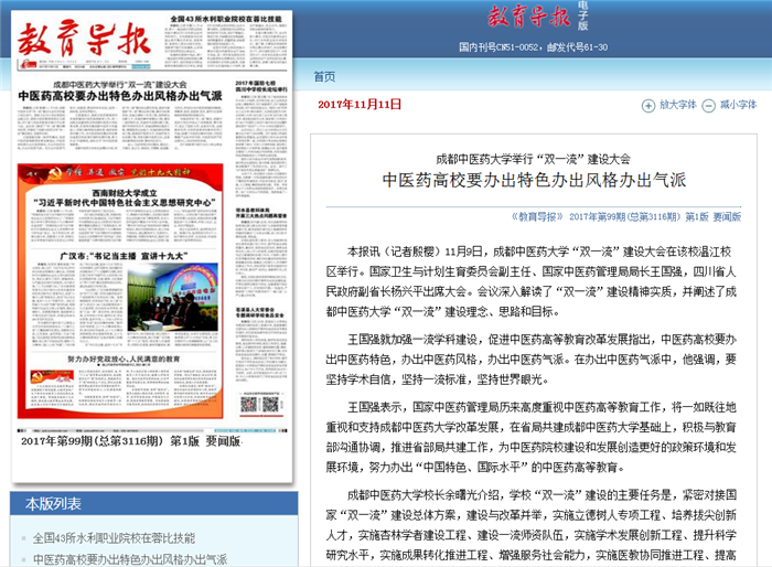 王国强就加强一流学科建设,促进中医药高等教育改革发展指出,中医药高校要办出中医药特色,办出中医药风格,办出中医药气派。在办出中医药气派中,他强调,要坚持学术自信,坚持一流标准,坚持世界眼光。