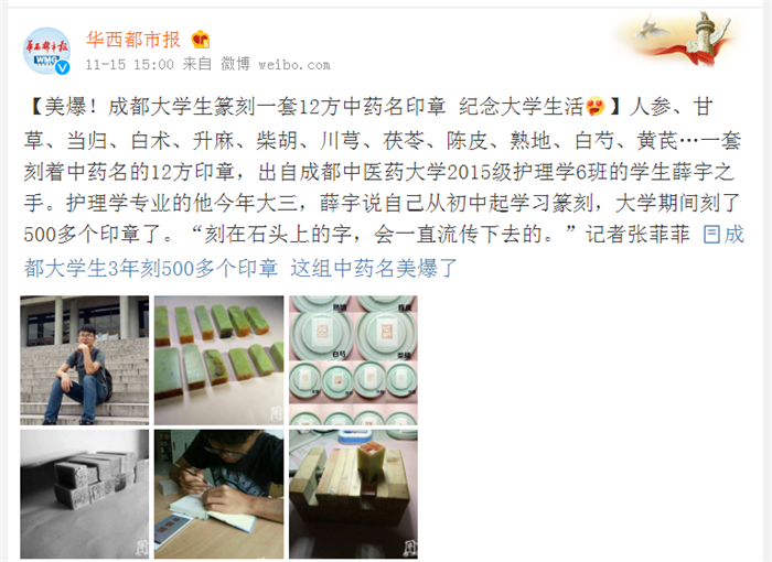 人参、甘草、当归、白术、升麻、柴胡、川芎、茯苓、陈皮、熟地、白芍、黄芪…一套刻着中药名的12方印章,出自pp电子官方网站2015级护理学6班的学生薛宇之手。护理学专业的他今年大三,薛宇说自己从初中起学习篆刻,大学期间刻了500多个印章了。“刻在石头上的字,会一直流传下去的。”