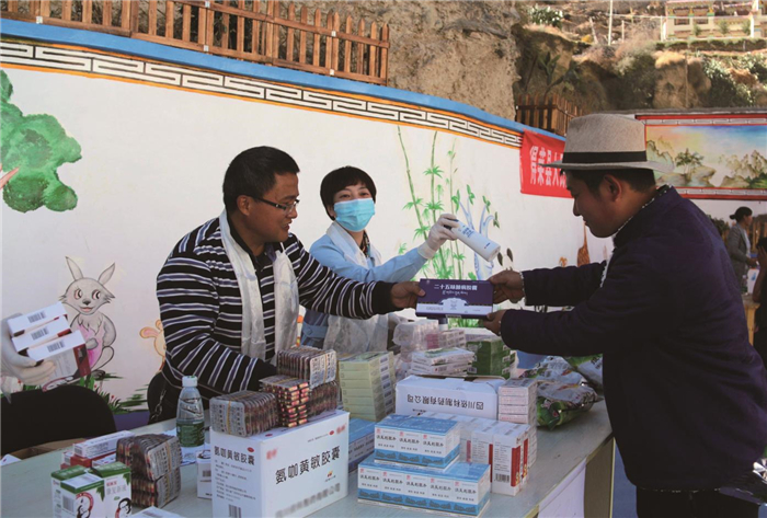 2017年12月16日,pp电子官方网站扶贫干部王张博士牵头在得荣县俄木学村开展义诊活动。(图片由学校提供)