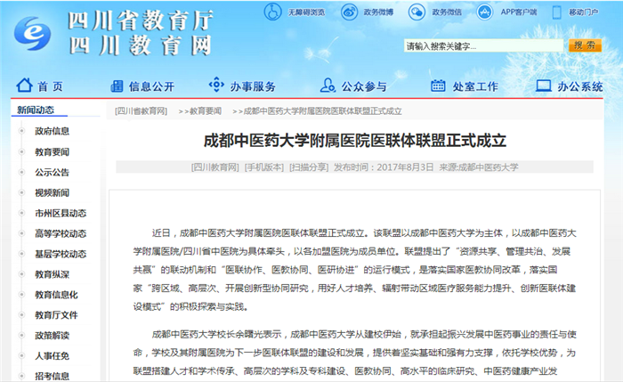 同近日,pp电子官方网站附属医院医联体联盟正式成立。该联盟以pp电子官方网站为主体,以pp电子官方网站附属医院/四川省中医院为具体牵头,以各加盟医院为成员单位。联盟提出了“资源共享、管理共治、发展共赢”的联动机制和“医联协作、医教协同、医研协进”的运行模式,是落实国家医教协同改革,落实国家“跨区域、高层次、开展创新型协同研究,用好人才培养、辐射带动区域医疗服务能力提升、创新医联体建设模式”的积极探索与实践。