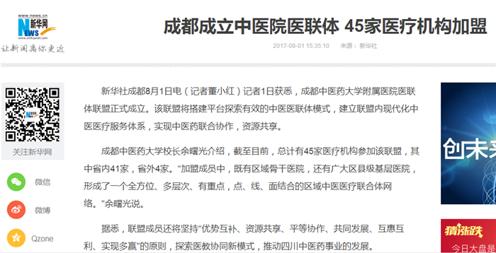 新华社成都8月1日电(记者董小红)记者1日获悉,pp电子官方网站附属医院医联体联盟正式成立。该联盟将搭建平台探索有效的中医医联体模式,建立联盟内现代化中医医疗服务体系,实现中医药联合协作,资源共享。