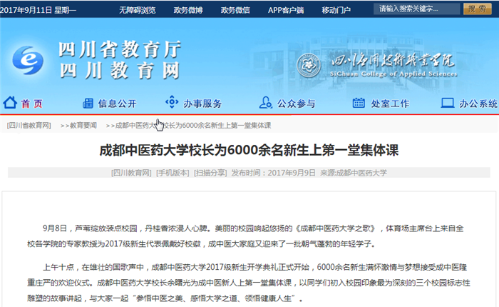 上午十点,在雄壮的国歌声中,pp电子官方网站2017级新生开学典礼正式开始,6000余名新生满怀激情与梦想接受成中医隆重庄严的欢迎仪式。pp电子官方网站校长余曙光为成中医新人上第一堂集体课,以同学们初入校园印象最为深刻的三个校园标志性雕塑的故事讲起,与大家一起“参悟中医之美、感悟大学之道、领悟健康人生”。