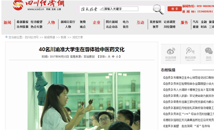 四川经济日报讯(李鑫 王菲 记者 王万川 文/图)6月12日,pp电子官方网站2017年“川渝高考学子中医药文化体验营”开营仪式在成都举行。来自四川省、重庆市29所中学的40名准大学生通过“和校长面对面”“杏林大师讲堂”等形式,正式开启了他们的“中医药文化之旅”。