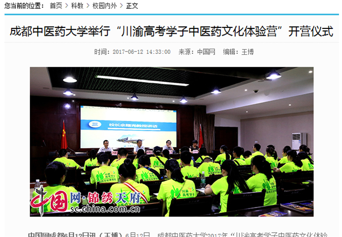 中国网成都6月12日讯(王博)6月12日,pp电子官方网站2017年“川渝高考学子中医药文化体验营”开营仪式在温江校区举行,来自四川省、重庆市29所中学的40名同学,开始了他们中医药文化的奇妙之旅。校长余曙光教授,校党委副书记、副校长沈涛教授,教务处副处长王世宇出席开营仪式,招生就业处处长叶军主持开营仪式。