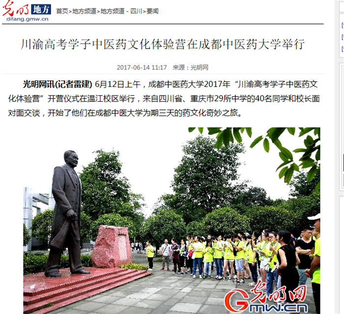 光明网讯(记者雷建) 6月12日上午,pp电子官方网站2017年“川渝高考学子中医药文化体验营”开营仪式在温江校区举行,来自四川省、重庆市29所中学的40名同学和校长面对面交谈,开始了他们在成都中医大学为期三天的药文化奇妙之旅。