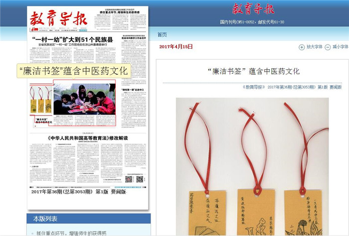 “权若附子,上可为救人药,下可为害人毒。”“做人,如甘草,不为名利而争;如防风,不为外邪而惧;如石斛,不为财色而诱;如大黄,不为非分而求。”……本是治病、防病的药用植物,经过药学院同学们灵巧的双手跃然纸上,成了别具一格的廉洁书签。同学们重温《本草纲目》,依托药用植物学教材,精心选择绘制决明子、厚朴、黄连、远志、莲等常见的药用植物,又将植物药性巧妙演绎为廉洁文化,使人眼前一亮。目前,由学生自发、手工绘制的廉洁书签已累计2500余张,学生在绘制过程中完成自我教育。小小书香卡美观实用,逢学校干部大会必发,既普及中药基础知识,还让广大党员、干部深受廉洁教育。