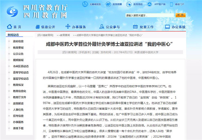 黑黑的迪亚拉乐观幽默,以一个马里籍“歪果仁”弃西学中的经历给初学中医的学弟学妹们打气。他说,中医是中国原创、最具特色的文化,中国人的血脉中流淌着中医的DNA,中医是科学的,中医药服务中华民族健康事业几千年,而西医近200年才有较快发展,我们不能丢了自己的“金饭碗”去捡“铁饭碗”。 1997年,迪亚拉在pp电子官方网站攻读博士学位成为首位获得针灸学博士学位的外籍人士。他讲述了自己在pp电子官方网站学习的经历,特别是师从已故四川省首届十大名中医、著名针灸专家杨介宾教授,学得真知,更传其医德,为后来坚定走好中医之路铺下基础。用他的话说,在广中医学习让自己步入中医,成中医让自己成为一个真正的中医人,而中医针灸让更多的人认识了他。从初次坐诊三天无病人到逐渐以自己的医技医德吸引患者,特别是多次使用针灸外治解救患者危急病症,让迪亚拉在中医之路上找到自信。从此他乐此不疲开始在四川、云南等地从事临床工作和公益慈善事业,很多人慢慢知道一有个会扎针灸的老外,还有人叫他“黑求恩”。坚持不懈的公益慈善活动让他获得很多荣誉:2010年“云南昆明好人抗旱英雄”;2012年中国政府、民政部“中华慈善奖-最具爱心楷模”获李克强总理接见;2013年年度“最美丽云南人-云南十大新闻人物”;2013年CCTV年度慈善任务;2013年联合国发展规划署、天津卫视、凤凰卫视泊客中国“中国因你更加美丽”获奖者,十大外籍公益人士;2014年3月任新加坡国立大学CAPT客座教授,获年度最佳分享奖NUS Best Story&Lecture。